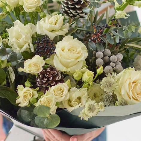 A striking bouquet of fresh and dried flowers in crisp, clean colours, chosen and arranged by the florist.