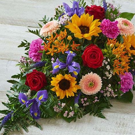 A beautiful, vibrant teardrop shaped mix featuring sunflowers, irises and germini.