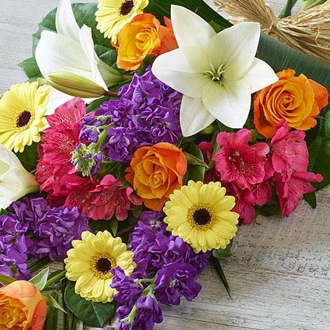 A bright, beautiful and fragrant combination of lilies, roses and stocks. Also featuring alstroemeria and aspidistra.