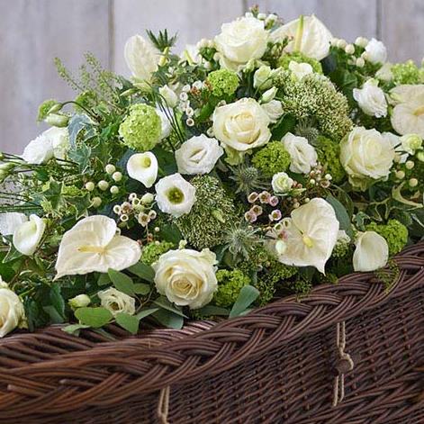 A beautiful casket spray in classic green and white colours, with the finest roses, calla lilies, anthurium and viburnum opulus.